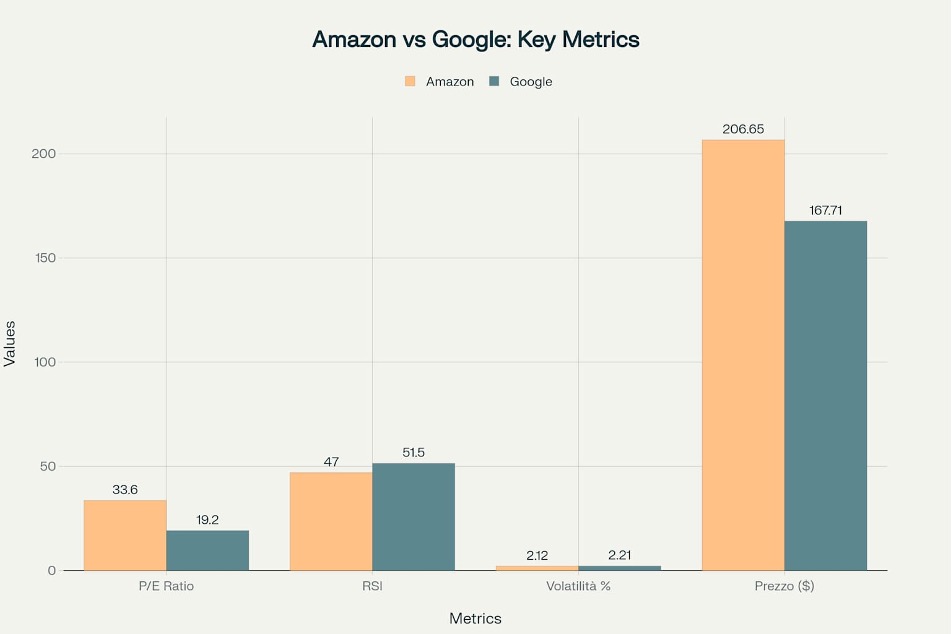 Dal punto di vista dell’analisi tecnica, entrambi i titoli mostrano indicatori neutrali con RSI rispettivamente a 47 (Amazon) e 51.5 (Google), suggerendo condizioni equilibrate senza situazioni di ipercomprato o ipervenduto. La volatilità comparabile (2.12% Amazon vs 2.21% Google) indica profili di rischio simili nel breve termine. Il rating tecnico di Amazon (7/10) superiore al neutrale di Google riflette il momentum tecnico più favorevole del primo nonostante la valutazione elevata.