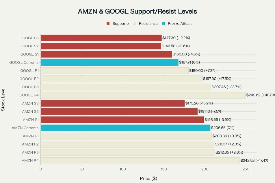 Mappa dei livelli tecnici chiave per Amazon e Google con distanze percentuali