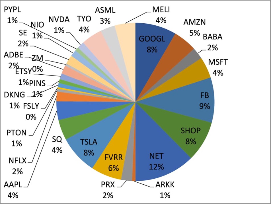 Composition of a technology investment portfolio, showing percentages allocated to different stocks.