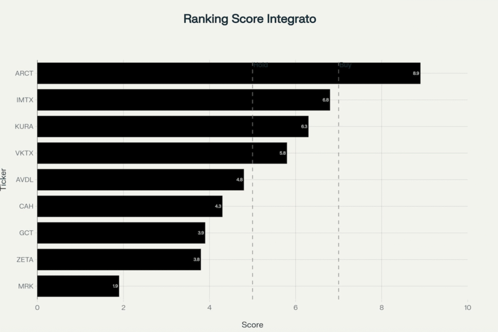 L’analisi integrata rivela una chiara gerarchia di opportunità di investimento, con Arcturus Therapeutics (ARCT) che emerge come unica “Strong Buy” con score 8.9/10, supportata da un rating Zacks “Buy” e upside potenziale del 406.13% . Immatics (IMTX) si posiziona al secondo posto con score 6.8 e rating Zacks “Buy”, mentre le posizioni biotecnologiche Kura Oncology e Viking Therapeutics mantengono rating “Hold” nonostante upside significativi rispettivamente del 348%