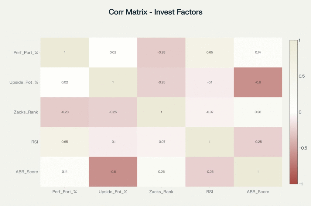 La matrice di correlazione rivela relazioni significative tra i fattori di investimento, con particolare evidenza della correlazione negativa tra Zacks Rank numerico e Upside Potential, confermando che i titoli con rating migliori tendono ad avere maggiori aspettative di crescita . L’RSI mostra correlazioni moderate con la performance del portafoglio, indicando che le condizioni tecniche di ipercomprato/ipervenduto influenzano le performance a breve termine .